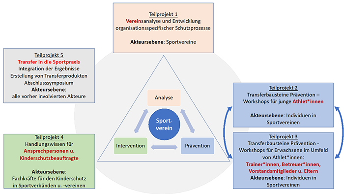 In Teilprojekt 1 wurde das Handlungsfeld der Analyse in den Fokus genommen, indem gemeinsam mit ausgewählten Vereinen Risikoanalysen zu sexualisierter Gewalt durchgeführt und darauf basierend Schutzprozesse entwickelt werden. Teilprojekte 2 und 3 waren im Handlungsfeld der Prävention angesiedelt und beinhalteten die Entwicklung, Durchführung und Evaluierung von Workshops für Athlet*innen, Trainer*innen, Eltern sowie Funktionär*innen/Vereinsmitarbeiter*innen zum Thema Empowerment von Athlet*innen. Weiterhin wurden in Teilprojekt 4 im Rahmen des Handlungsfeldes der Intervention konkrete Hilfestellungen für Ansprechpersonen zum Kinderschutz in den Landessportbünden/-jugenden und Vereinen entwickelt. Diese sollten dazu dienen, Vereine bei Verdachts-/Vorfällen besser unterstützen zu können. Im fünften und letzten Teilprojekt wurden konkrete Transferprodukte für Sportvereine aus allen vorab stattfindenden Teilprojekten entwickelt. Bei Projektende wurden diese über die beteiligten Praxispartner*innen allen Sportvereinen in Deutschland zur Verfügung gestellt. Außerdem wurden diese Transferprodukte mittels eines Abschlusssymposiums an die Sportpraxis vermittelt.